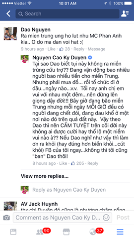 Nữ MC viết: “Tại sao biết tụi này không ra miền Trung cứu trợ? Đang vận động bao nhiêu người, bao nhiêu tiền cho miền Trung. Nhưng phải mua đồ rồi tổ chức đi ở đâu, ngày nào…Tối nay chị em vui với nhau một đêm nên đừng lên giọng dậy đời. Bây giờ đang bão ở miền Trung nhưng mỗi ngày, mỗi giờ đều có người đang chết đói, đang đau khổ ở một nơi nào đó trên trái đất này. Vậy theo Dao thì nên cấm tuyệt trên cõi đời này không được ai cười hay thổ lộ một niềm vui nào à? Nếu Dao nghĩ vậy thì làm ơn ra khỏi facebook của tôi ngay… Không thì tôi cũng “ban” Dao thôi”.