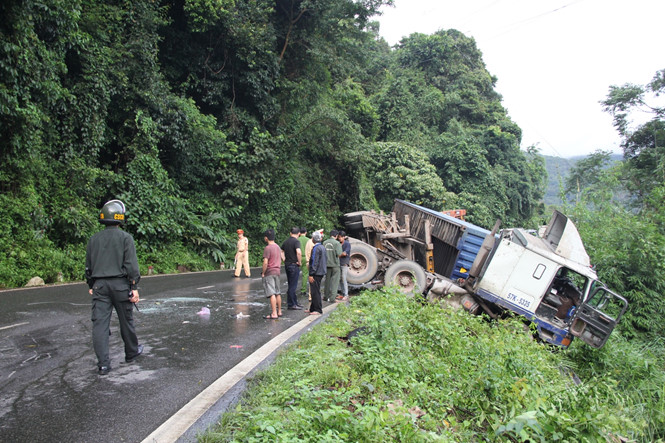 Sau cú va chạm, xe khách bị lật ngửa, 6 hành khách trong xe la hét thất thanh. Tại hiện trường, xe đầu kéo bị lật nghiêng, đầu xe 'treo' trên miệng vực.