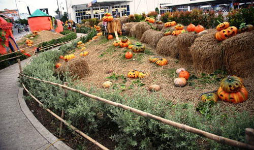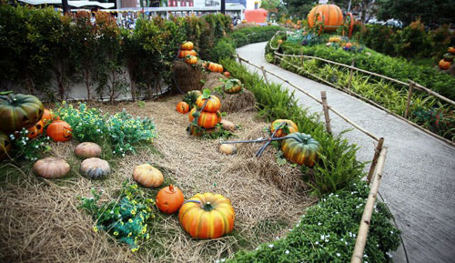 Khu vườn được dựng theo kiểu ngôi làng với hàng trăm quả bí ngô nằm dọc con đường trải đầy rơm.