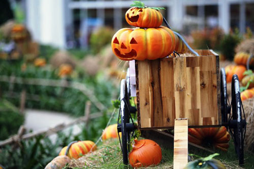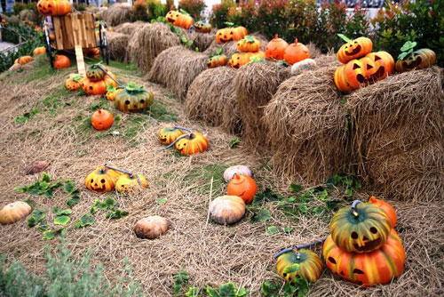 Khu vườn được dựng theo kiểu ngôi làng với hàng trăm quả bí ngô nằm dọc con đường trải đầy rơm. Những quả bí ngô được khoét rỗng ruột tạo thành hình khuôn mặt có mắt mũi miệng