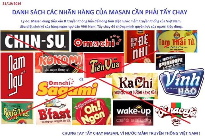 Mới đây người dân Việt đồng loạt kêu gọi tẩy chay thương hiệu nước chấm từng được nhiều người dân trong nước tin dùng.Ngoài ra thương hiệu này còn mượn truyền thông để đưa những thông tin lừa người tiêu dùng.Đó là thương hiệu Masan bao gồm nhiều mặt hàng: nước chấm,nước tương,mì tôm......Sự giả dối của thương hiệu này được thể hiện ngay trên bao bì của sản phẩm.
