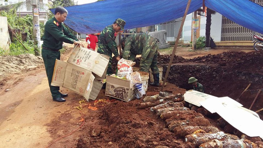 Vụ việc này xảy ra tại phường Thành Nhất, TP Buôn Ma Thuột khiến nhiều người choáng váng. Trong khi đang thi công đường ống nước sạch, lực lượng chức năng đã phát hiện số lượng lớn bom mìn còn sót lại từ chiến tranh ngay trong khu dân cư. Hiện Bộ Chỉ huy quân sự đang tiếp tục tìm kiếm những quả bom còn lại quanh khu vực này.