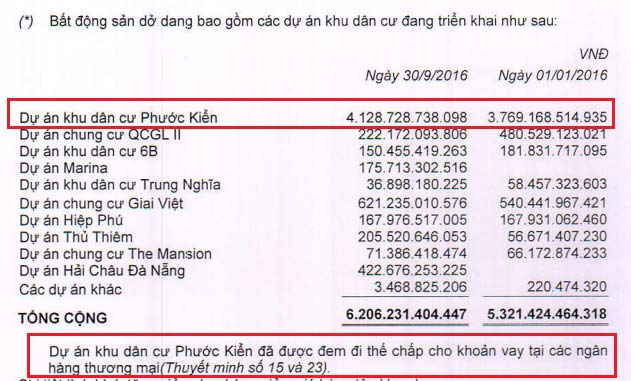 Các dự án bất động sản đang triển khai như khu dân cư Phước Kiển, khu dân cư lô 4 khu chức năng 6B – Đô thị mới Nam TP HCM, … được dùng làm tài sản bảo đảm cho các khoản vay vốn đầu tư.