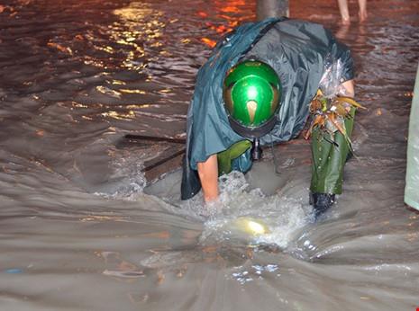 Một thượng sĩ công an đã đến cống thoát nước ven đường Đồng Khởi để móc rác, khơi thông dòng chảy.