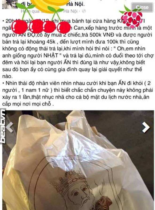 Chiều 11/12, thông tin phản ánh về việc một nữ khách hàng người Ấn Độ đưa 500.000 đồng mua 2 chiếc bánh mỳ nhưng nhân viên cửa hàng bánh ở phố Lương Văn Can (Hà Nội) lại chỉ trả lại 45.000 đồng tiền thừa đang khiến cộng đồng mạng xôn xao.