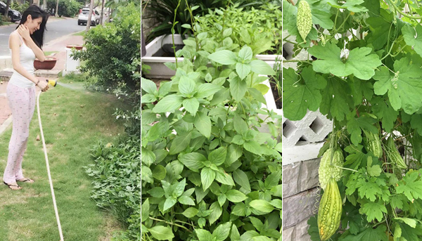 Rau trong vườn nhà Thủy Tiên – Công Vinh lên xanh tốt tới mức ăn không xuể. Những khi quá nhiều, cô thường hái bớt mang biếu hàng xóm. Cô có một bí quyết là dùng vỏ lạc đập vụn phủ lên đất trồng rồi tưới nước đều đặn 2-3 lần mỗi ngày. Vỏ lạc được xem là một loại phân bón cải tạo đất và thẩm thấu nước, từ đó kích thích cây lớn nhanh.