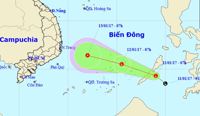 Trên biển, một vùng áp thấp đang hoạt động và áp sát khu vực Biển Đông. Hồi 7 giờ sáng nay (11/1), áp thấp đang cách miền Trung đảo Pa-La-Oan (Philippines) khoảng 50km về phía Đông Nam.