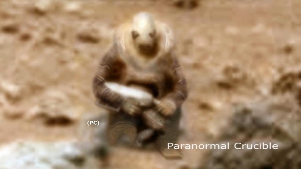 Theo báo Anh Mirror, các tay thợ săn người ngoài hành tinh mô tả, người lính cổ đại trên sao Hỏa mặc bộ đồ không gian và cầm vũ khí trong bức ảnh mà robot thăm dò Curiosity của NASA chụp được. Một số người tin rằng, người lính cổ đại trên đã bị hóa đá.