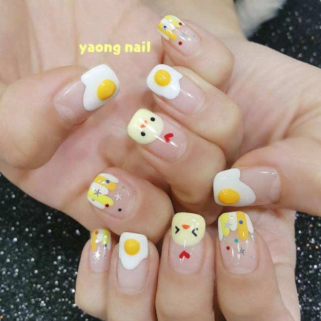 Hoặc vẽ cả những concept gà con hoành tráng đi cùng trứng ốp lết thế này trên lớp nền trong suốt cũng sẽ giúp năm 2017 của bạn thêm bừng sáng. (Ảnh: Instagram @yaong_nail)