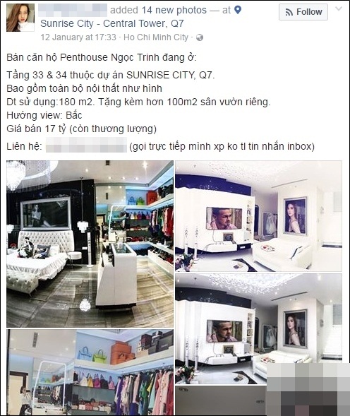 Căn hộ của Ngọc Trinh được người môi giới bất động sản rao bán với giá 17 tỷ. Thông tin này được đăng tải từ ngày 12/1 vừa qua.