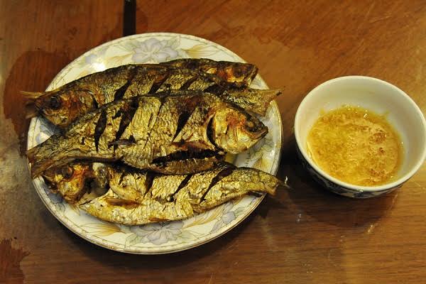 Cá đã nướng thơm được gỡ khỏi que rồi mới mang ra rán, ăn nóng kèm theo đĩa rau thơm và bát nước mắm chanh ớt (cũng có thể chấm tương Bần), thêm chút tỏi, gừng băm nhỏ sẽ càng làm tăng thêm vị thơm ngon của cá.
