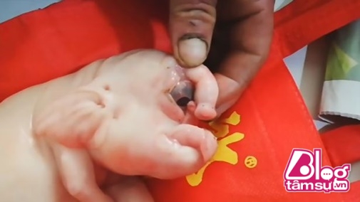 Lợn con sinh ra không có lông, toàn thân bao phủ lớp da trắng trơn như bạch tạng, chi trước và sau đều mềm nhũn. Đặc biệt, đầu mang tai lợn nhưng lại có 1 mắt và xuất hiện vòi giống như voi rất ghê sợ.