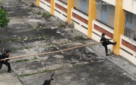 Trước sự ngạc nhiên của người xem, nhóm cảnh sát cơ động chỉ dùng một thanh tre cắm vào tường, trong khi một người leo dần lên trên tường của tòa nhà ba tầng với góc gần như vuông 90 độ. Chỉ vỏn vẹn chưa đến 10 giây, anh cảnh sát đã leo thành công và chinh phục tòa nhà cao hơn 9m.