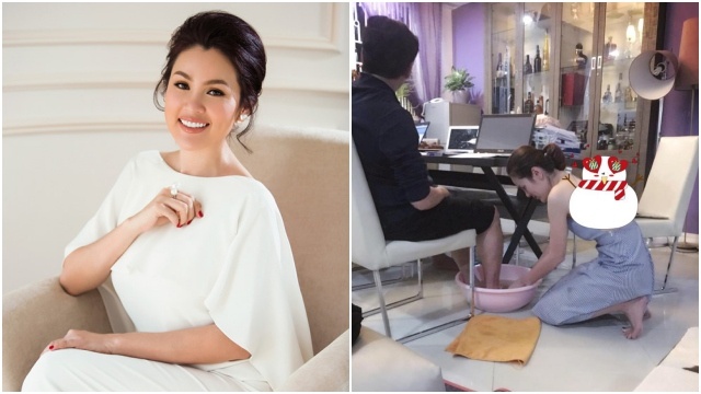Bức ảnh về hành động rửa chân cho chồng của Á hậu Phương Lê gây tranh cãi những ngày qua.