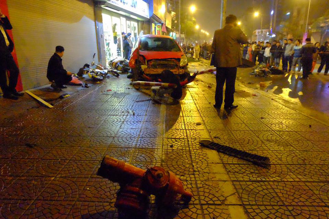 Khoảng hơn 8h tối 7/3, chiếc ô tô 4 chỗ màu đỏ hiệu Yaris do một người đàn ông trung tuổi (chưa rõ danh tính) điều khiển bất ngờ đâm liên tiếp vào gần 10 xe máy đang chạy trên đường Nguyễn Văn Cừ, quận Long Biên, Hà Nội.