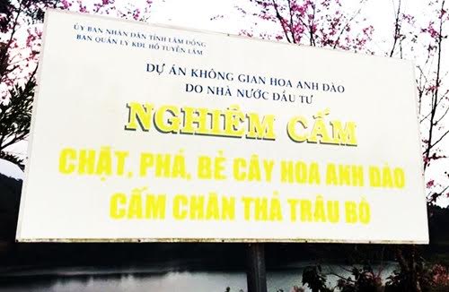 Biển cấm bẻ hoa tại hồ Tuyền Lâm