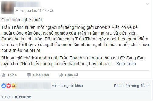 Riêng em là em rất đồng ý với chị về cái này, làm nghệ thuật đâu chỉ cho mỗi giới trẻ thiếu khôn, thiếu cảm nhận nghệ thuật để xem đâu, mà còn có biết bao nhiêu con người già trẻ đủ để biết hài Trấn Thành nó nhạt và nhảm thế nào".