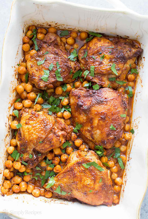- Xếp các miếng gà lên trên khay hành tây, để phần da gà hướng lên trên, những hạt đậu nằm xen kẽ cùng với gà.