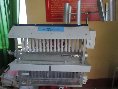 Các em đã sử dụng một hệ thống ống nhôm đặt thẳng đứng xuyên qua mái nhà, hai đầu ống được bịt kín, bên trong ống đựng dung dịch làm mát động cơ xe máy. Đầu trên của ống được quấn một lớp vải thấm nước tốt, các mảnh vải được nhúng trong một máng đựng nước có van điều tiết mức nước tự động.