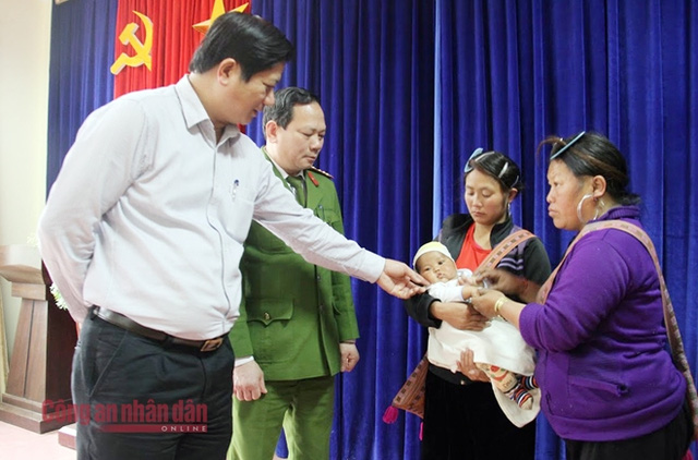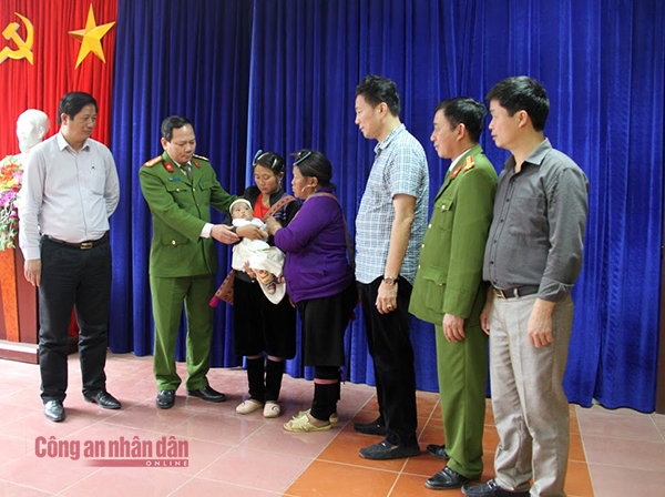 Lãnh đạo Công an tỉnh Lào Cai chia vui với gia đình cháu bé.