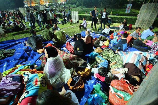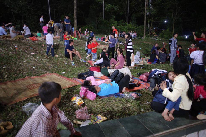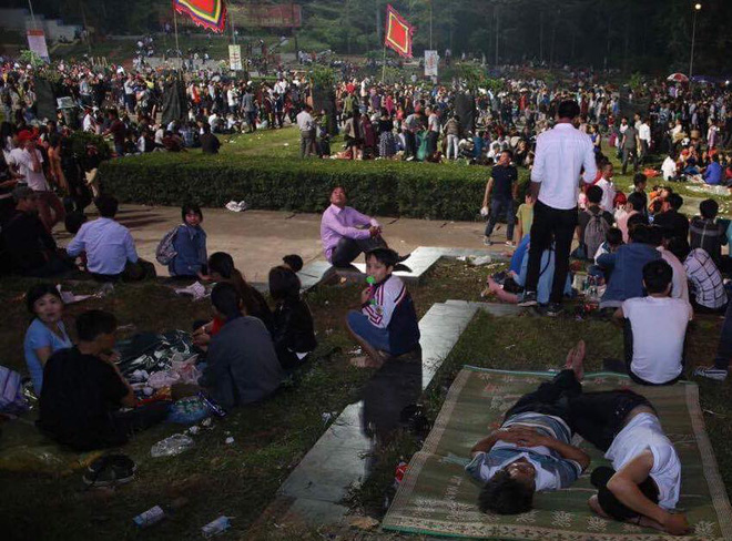 Nhiều người trải chiếu ngủ trên bãi cỏ để có thể dâng hương sớm nhất vào sáng ngày mai