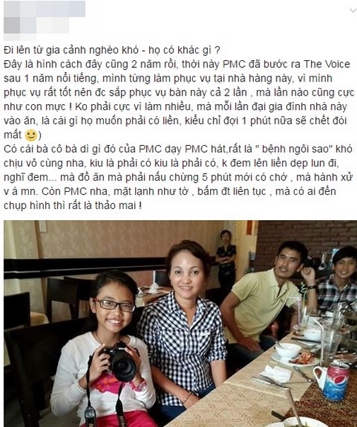 Mới đây, trong một nhóm trên Facebook đã có một người chia sẻ ý kiến cá nhân về Phương Mỹ Chi. Cụ thể bài viết cho rằng Phương Mỹ Chi và gia đình vào quán ăn nhưng lúc nào cũng trong tình trạng khá ‘chảnh’. Còn riêng chị Bảy mặt lúc nào cũng lạnh như tờ, bấm điện thoại liên tục, lúc có người đến xin chụp hình cùng thì lại rất vui vẻ.