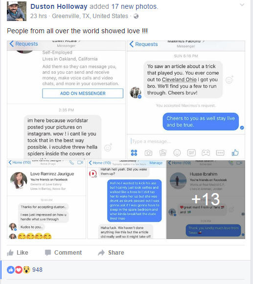 Bên dưới dòng chia sẻ của Duston, hàng nghìn người dùng mạng trên khắp thế giới đã để lại lời khen cho sự bình tĩnh và hài hước của anh chàng trong tình cảnh khá thảm thương của mình. "Cậu thật là một người tuyệt vời. Tôi chắc chắn, một ngày nào đó, cậu sẽ tìm được người xứng đáng hơn", một người dùng mạng bình luận.
