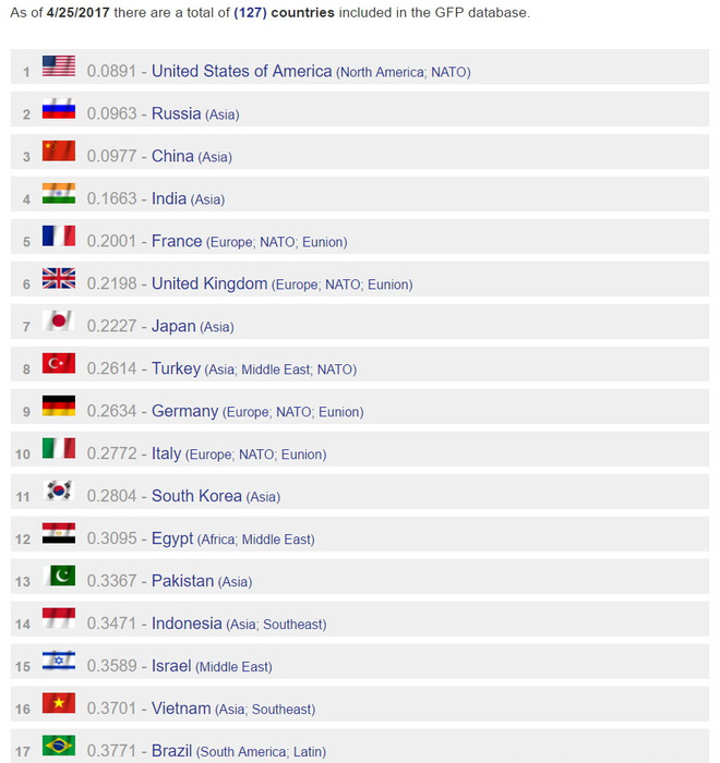 Tuy nhiên cũng cần nhắc lại một lần nữa là bảng xếp hạng chỉ số sức mạng quân sự toàn cầu của Global Firepower không phải một kênh thông tin chính thống, nó chỉ đơn thuần mang ý nghĩa tham khảo.