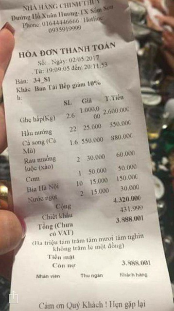 Mới đây, trên một số diễn đàn đă đăng tải h́nh ảnh hóa đơn tính tiền về một bữa ăn tối 2/5 tại nhà hàng Chinh Thủy (TP Sầm Sơn, Thanh Hóa) với tổng số tiền phải thanh toán hơn 3,8 triệu đồng.