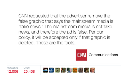 CNN ngày 2/5 đăng tweet yêu cầu chính quyền Trump xóa bỏ phần đồ họa "sai trái" cáo buộc các truyền thông lớn làm "tin giả". "Đoạn quảng cáo sẽ được chấp nhận chỉ khi phần đồ họa đó được xóa đi. Đó là sự thật", CNN tuyên bố.