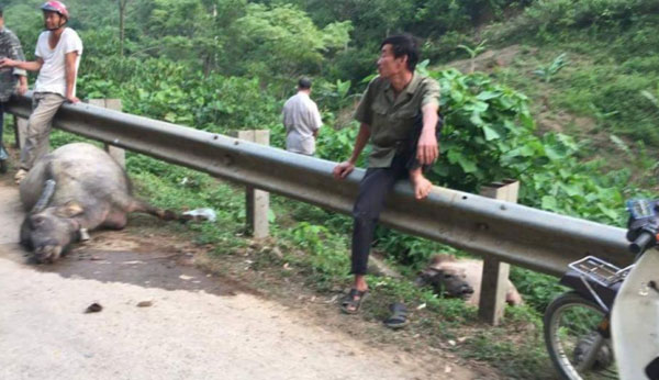 Trâu, nghé chết tại chỗ sau khi bị chiếc xe ô tô đâm tại Lạng Sơn.