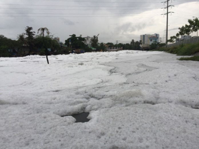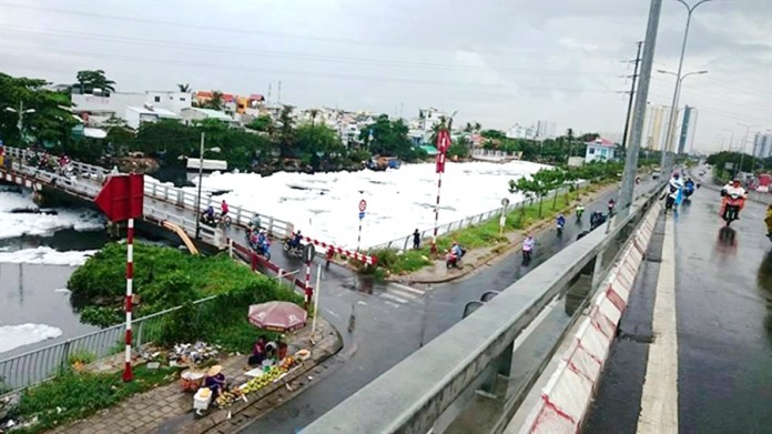 Sau trận mưa lớn, trên kênh Tàu Hủ, quận 8, xuất hiện nhiều bọt trắng xốp, nổi thành từng mảng lớn, bốc mùi hôi thối bay khắp nơi khi có gió, khiến người dân phải đóng cửa nhà vì lo ô nhiễm.