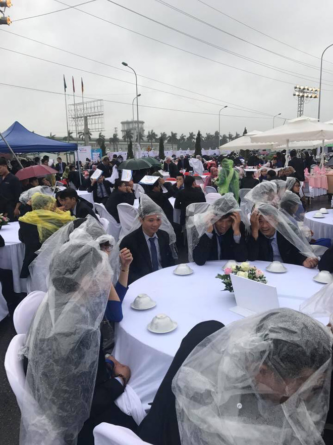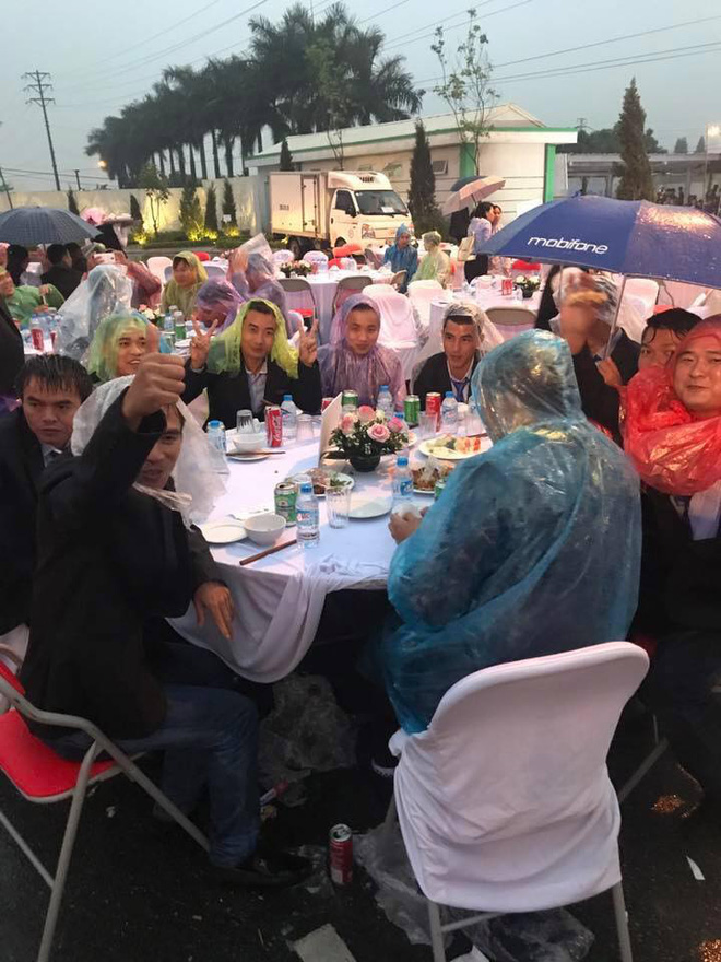 Khách mời người thì mặc áo mưa, người thì đội ô để ở lại chúc mừng đám cưới của cặp đôi nhân vật chính. (Nguồn ảnh: Facebook)