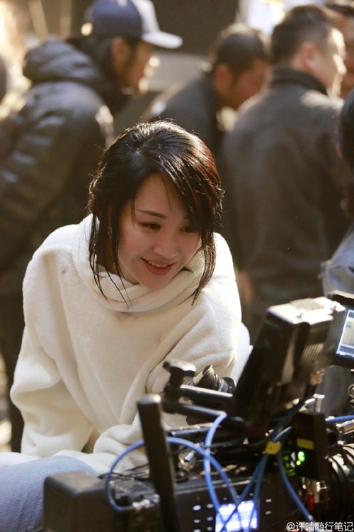 Hứa T́nh xem lại một cảnh quay của ḿnh trên phim trường.