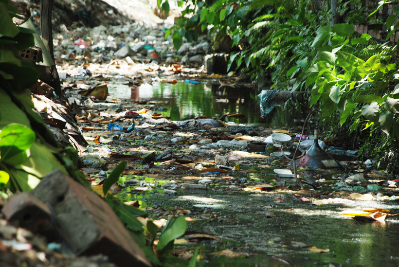 Tại đầu các miệng cống, rác thải sinh hoạt chất đầy kênh với nhiều loại như: bao nilon, chai nhựa, bịch xốp...Trong đó, ô nhiễm hơn hết là các phế phẩm của gà, vịt, chó...trong quá trình giết mổ tại khu Chợ Chó gần đó, cũng trực tiếp xả thẳng xuống kênh.