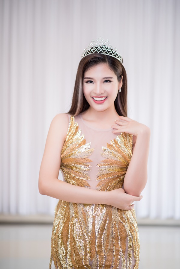 Với thiết kế vải xuyên thấu cùng hoa văn kim sa màu vàng lấp lánh và chiếc vương miện trên đầu, Phan Hoàng Thu lộng lẫy như “phượng hoàng lửa”.