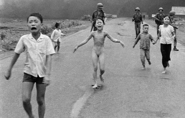 Bức ảnh lịch sử về "Em bé Napalm" với hình ảnh Kim Phúc bị bom Napalm đốt cháy hết quần áo đang bỏ chạy khỏi ngôi làng-nơi Mỹ vừa ném xuống một trái bom napalm cỡ lớn. Nguồn ảnh: DM.