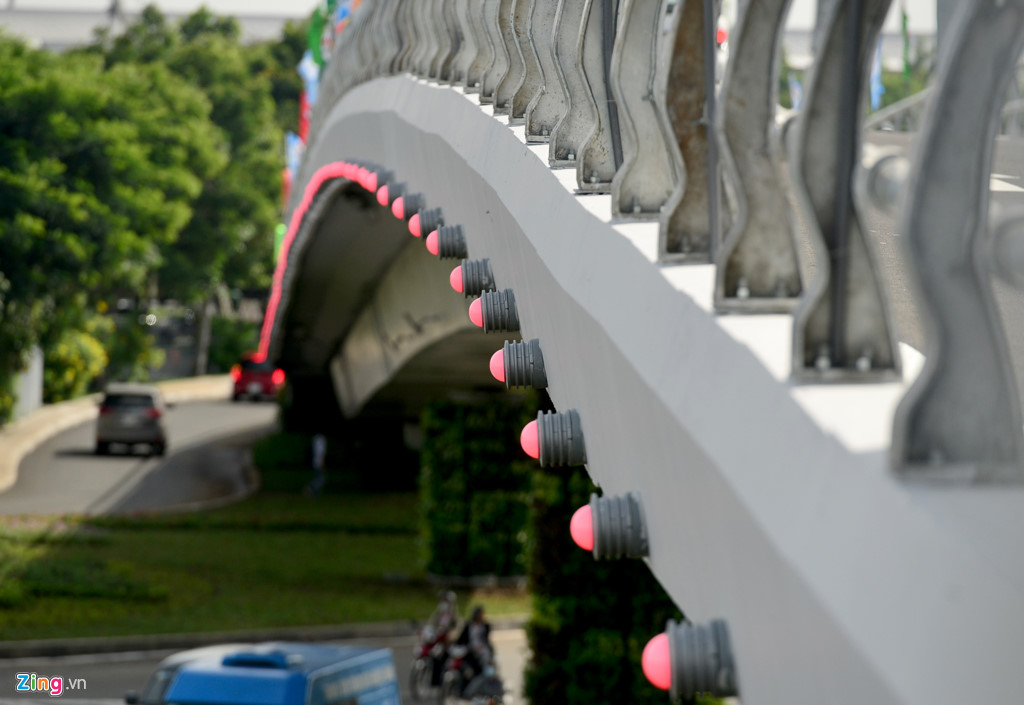 Hệ thống đèn thay đổi màu liên tục bên thành cầu sẽ phát sáng vào ban đêm.