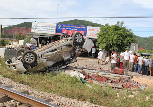 Tại hiện trường, chiếc xe bẹp dúm nằm phơi bụng cạnh đường ray. Một cọc sắt dựng bên đường ray gãy ngang vì bị ôtô văng trúng, nhiều viên ngói xếp bên đường sắt cũng bị xe đè dập nát.