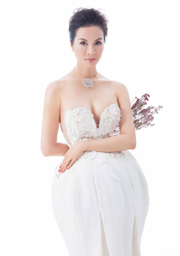Bộ đầm trắng như một nụ sen cách điệu giúp chị khoe cơ thể quyến rũ