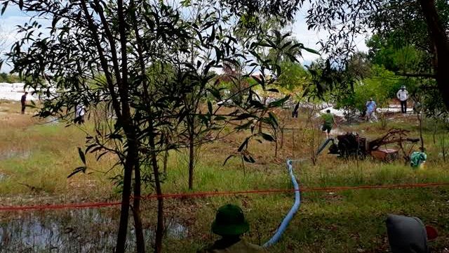Một chiếc máy bơm với 2 vòi nước lớn được đưa tới hiện trường, rút nước trong hồ, tìm các vật chứng phục vụ công tác điều tra.