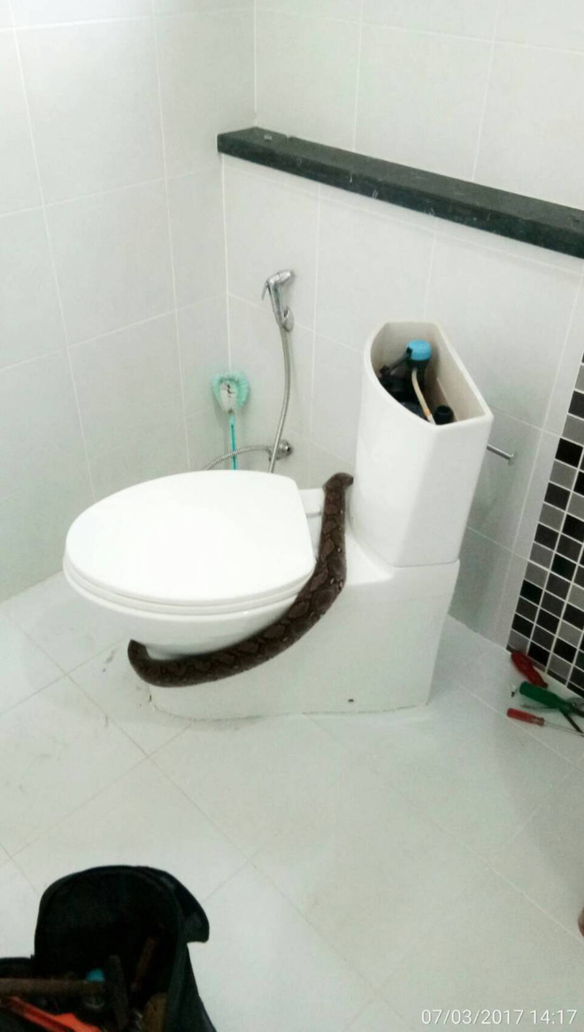 Hình ảnh con trăn gấm cuộn quanh chiếc bồn cầu khiến ai nhìn thấy đều muốn chạy thật xa.