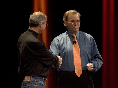 Nhiều chuyên gia công nghệ cho rằng, Apple và Google sẽ là những đối thủ “không đội trời chung” khi tranh giành thị phần trên phân khúc điện thoại di động. Tuy nhiên, ông Eric Schmidt – CEO của Google lại xuất hiện trên sân khấu cùng Steve Jobs khi ra mắt iPhone đầu tiên. Thậm chí, vị lãnh đạo này còn ca ngợi đây là “một sản phẩm đáng kinh ngạc”, giúp Apple và Google có thể dễ dàng liên kết hợp tác.