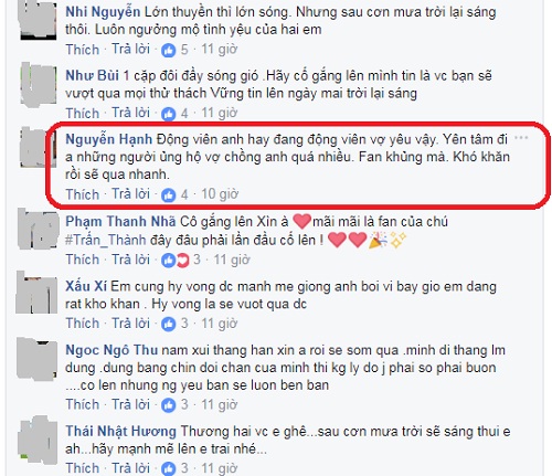 Từ góc độ khác, nhiều người cho rằng, thông điệp "Đi rồi sẽ đến" của Trấn Thành như lời động viên và an ủi vợ giữa ồn ào vạ miệng. "Lửa thử vàng gian lan thử sức. Mình sẽ thất bại nếu như tự đánh mất chính mình. Chúc 2 bạn mãi là đôi bạn đồng hành của nhau" - Facebooker Dịu Candy bày tỏ.