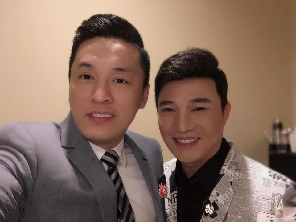 Lam Trường vui vẻ chụp ảnh cùng đàn anh Quang Linh ở hậu trường. Mặc dù theo đuổi hai dòng nhạc khác nhau nhưng anh hai vẫn rất thân thiết.