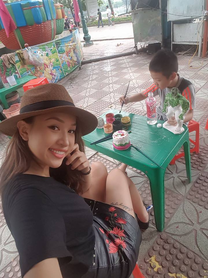Thanh Vân đưa con trai đi chơi và tô tượng ở công viên. Lâu lắm mới có thời gian bên con nên cô nàng phải tranh thủ ghi lại từng khoảnh khắc.