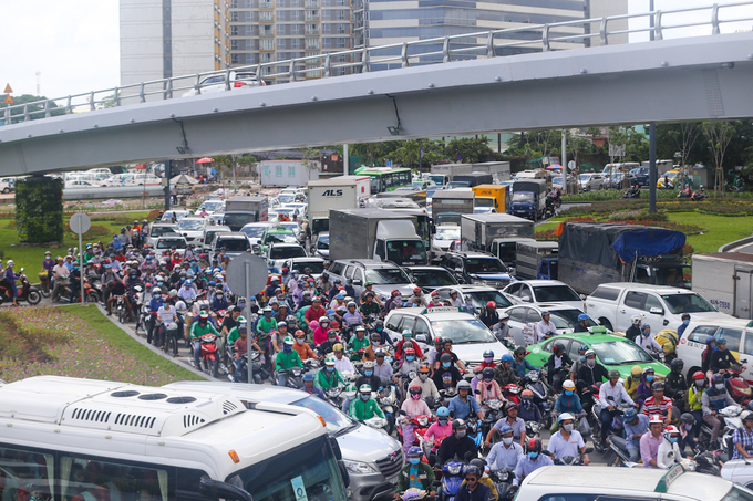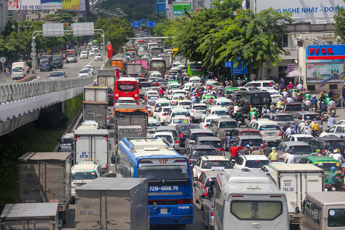 Tại cổng vào sân bay ở đường Trường Sơn, hàng nghìn xe cộ ùn ứ dưới gầm cầu vượt. Ở khu vực này, lượng xe từ đường Phạm Văn Đồng, Bạch Đằng đổ về đông đúc nên thường xuyên xảy ra ùn tắc.