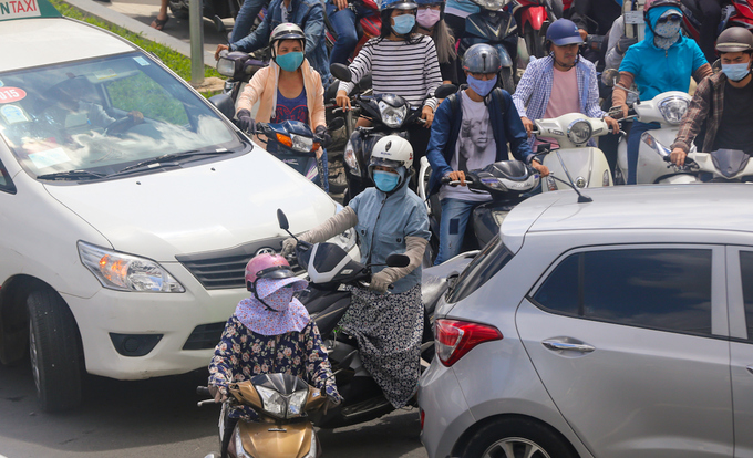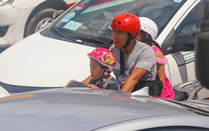 Thời tiết oi bức, người đi xe máy mệt mỏi khi chen chúc giữa dòng ôtô.
