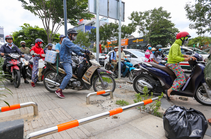Hàng dài xe cộ leo lên vỉa hè đường Trường Sơn tìm lối thoát khác nhưng giữa chừng bị chặn ngang bởi rào chắn vỉa hè.