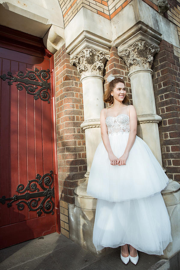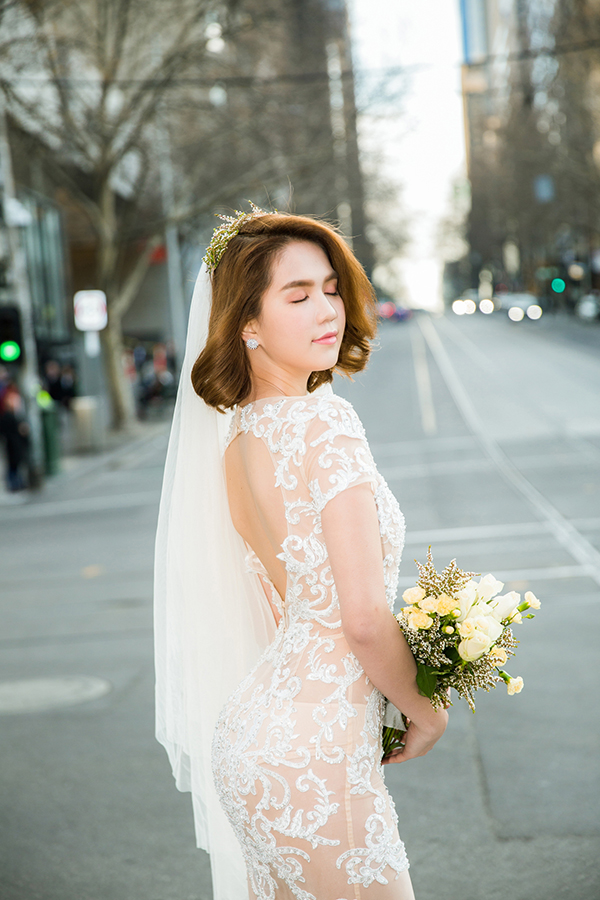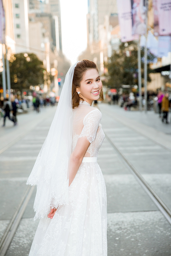 Trong chuyến công tác tại Melbourne, Australia, Ngọc Trinh đã kết hợp cùng nhà thiết kế Đỗ Long thực hiện bộ ảnh giới thiệu các mẫu váy cưới.